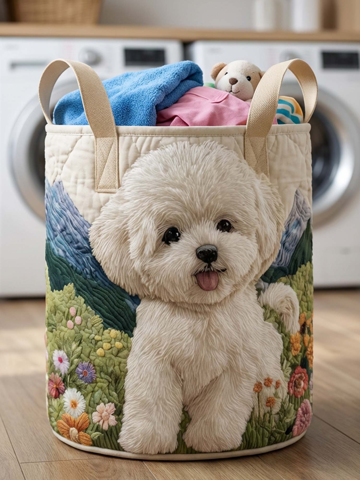 Crafted from a premium Jetiy cotton-poly blend, our quilted laundry basket is built to last. The fabric is thick and structured enough to resist everyday splashes or spills, yet still soft and breathable perfect for real-life use without feeling heavy or stiff. It also features durable canvas handles, securely stitched for easy and reliable carrying around the house. - Design Placement: