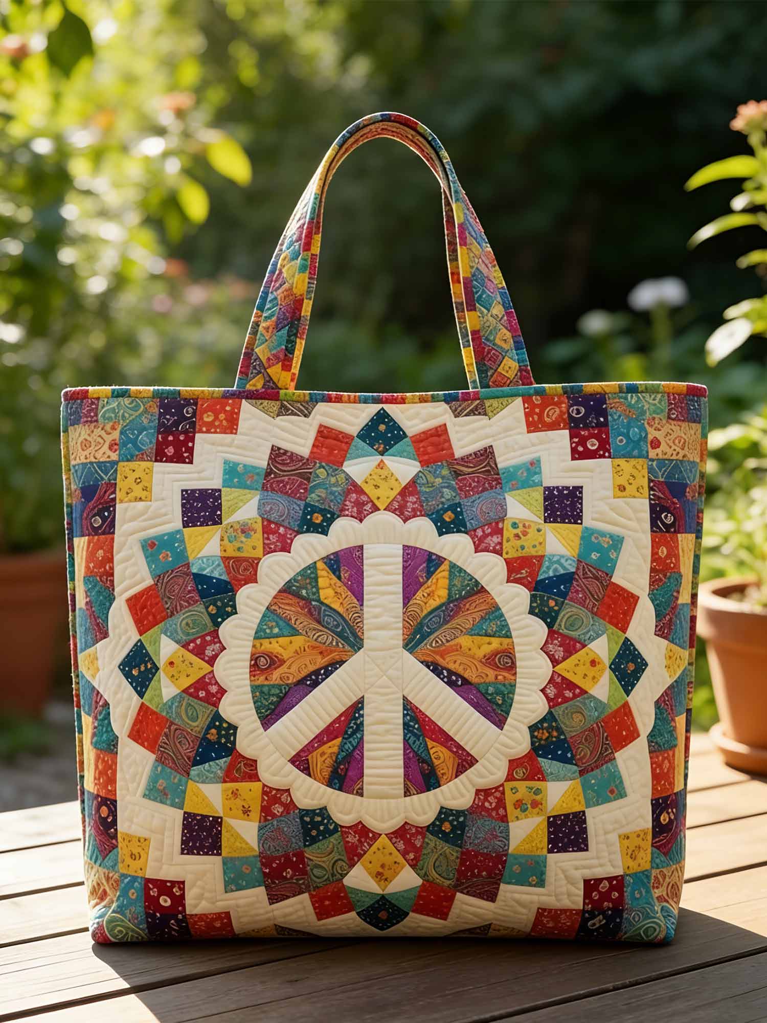 Hippie Peace Patchwork Quilted Tote Bag