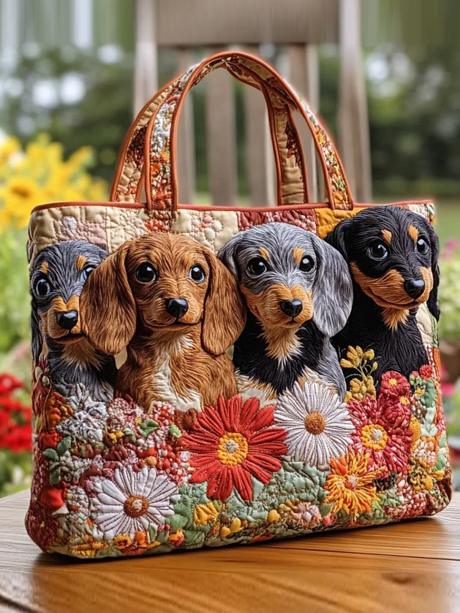 Quilted handbag with puppy and flower pattern