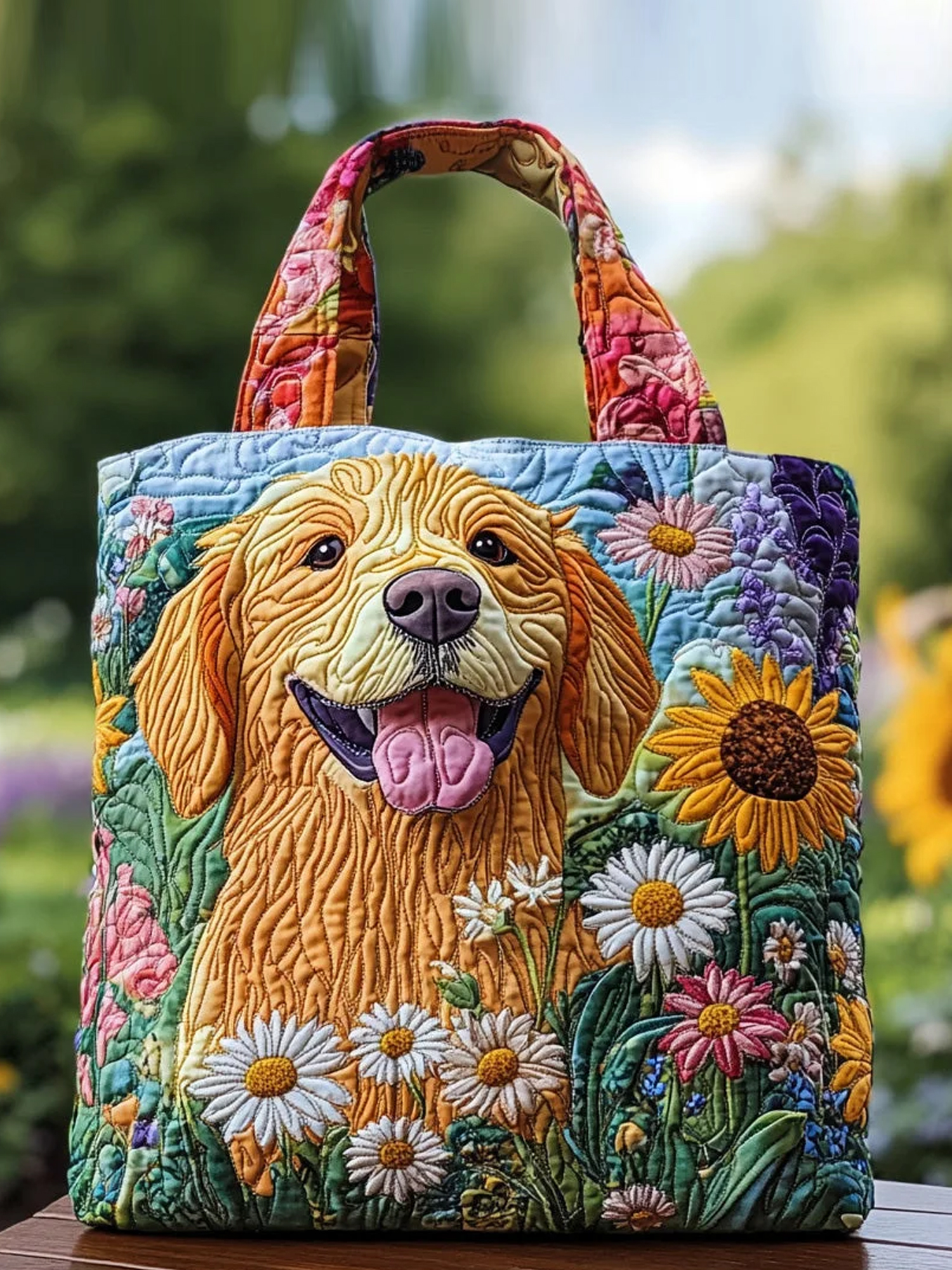 Quilted handbag with puppy and flower pattern