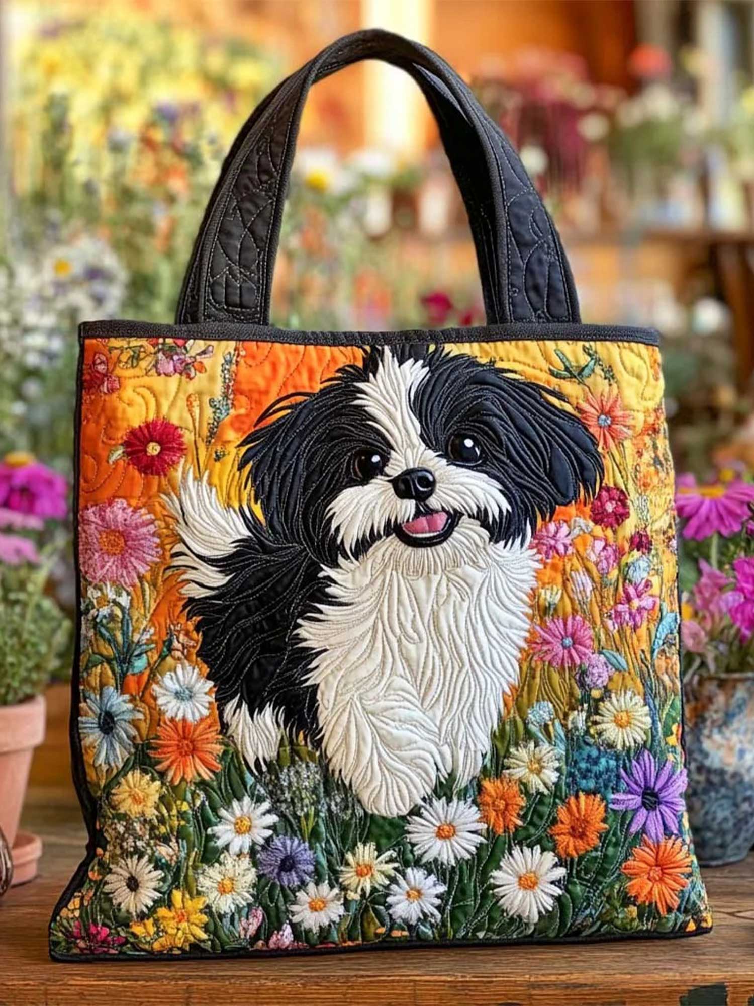 Shih Tzu and Flowers Quilted Tote Bag